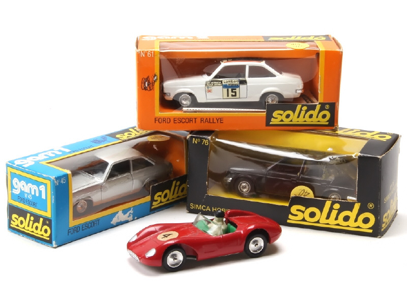 comprend : SIMCA HORIZON, FORD ESCORT (2 exemplaires différents) & FERRARI 500 (sans boîte) en état 'B'