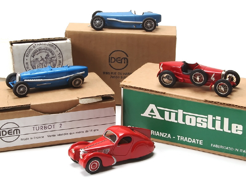 miniatures reproduisant les modèles : BUGATTI (2 exemplaires), DELAGE (train avant à recoller) & FIAT - on y retrouve notamment les marques : IDEM & AUTOSTILE - possibilité de petits accessoires manquants