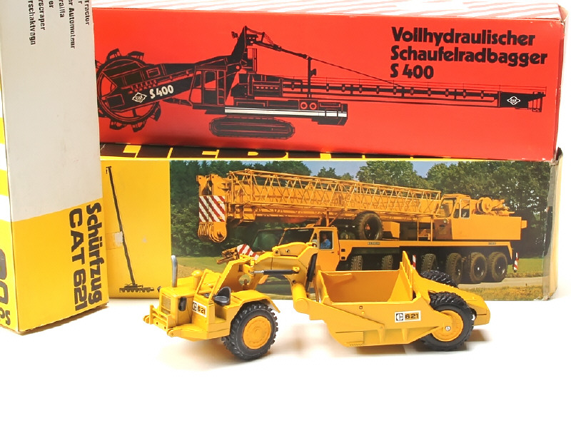 comprend : CATERPILLAR 621 SCRAPER, LIEBHERR LT 1100 grue automotrice & O&K S400 tapis roulant sur chenilles (état A-) - on y retrouve les marques : NZG & GESCHA - une boîte en état 'd' - manque quelques accessoires