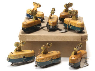 dimension du coffret : 21 x 20 cm - contient : 8 exemplaires (4 manquants) - moteurs à clefs (7 fonctionnent ) - avec clefs (une manquante) - légères traces d'oxydation par endroits avec quelques petits manques de peinture sur certains exemplaires - carrosseries plus ou moins encrassées - annotations au crayon sur la boîte (légèrement tachée)