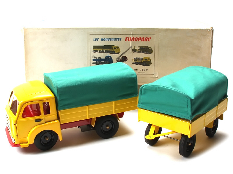 longueur de l'ensemble 55 cm - avec moteur à clef (fonctionne), direction & clef (petites traces d'oxydation) - un micro éclat sur la ridelle arrière de la remorque - avec cale de boîte - SUPERBE !