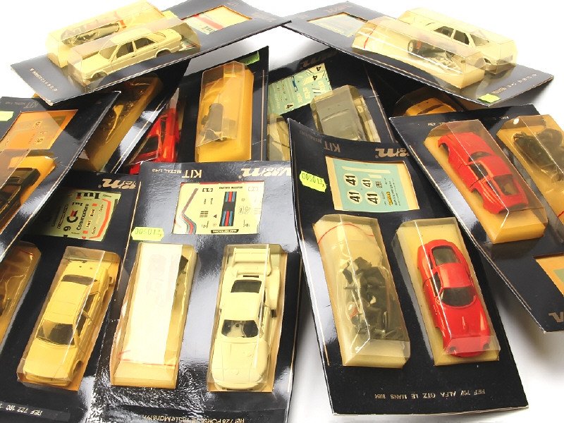 véhicules à assembler - possibilité de petits accessoires manquants - miniatures reproduisant notamment les modèles : PORSCHE, MERCEDES & ALFA ROMEO - quelques boîtes en état 'c' avec blisters jaunis & incomplets