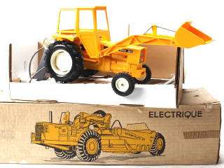 longueur 42 cm - moteur à piles (non testé) - avec direction - quelques traces d'oxydation - avec notice (légèrement endommagée) - on y joint un CATERPILLAR scraper (état 'B'-'b') avec moteur à piles (non testé) de la marque SIMAP