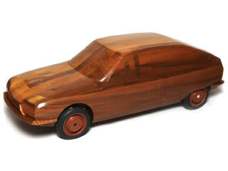 réalisation en bois (assemblage de différentes parties) - longueur 83 cm - modèle destiné pour les tests aéodynamiques de la fin des années 60 - manque une banane de pare-chocs, une vis de fixation de roue & 2 gommettes autocollantes d'enjoliveur - une gouttière de toit incomplète & un petit manque sur un entourage d'un optique de phare