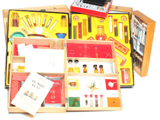 comprend : 2 mallettes 'ingénieur chimiste', un laboratoire électronique, un jeu d'optique avec lanterne & une mallette d'enthomologiste (incomplète) - on y retrouve principalement la marque GEGE - quelques substances altérées - possibilité de petits accessoires manquants