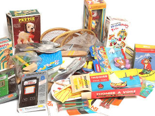 comprend notamment : tir aux pigeons, raquettes en bois, fléchettes avec cibles, battery toys (non testés), jeux éducatifs... - on y retrouve notamment les marques : PLAYSCHOOL, CONGOST, T.N, RUT & MB - on y joint une boîte de poupée PRESTIGE (en état 'd') de la marque GEGE - possibilités de petits manques & parties cassées - certains exemplaires avec boîte (états de 'b' à 'c')