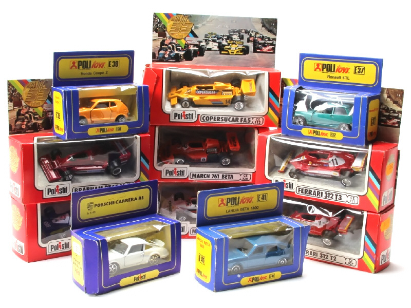 miniatures reproduisant notamment les modèles : RENAULT, LANCIA, HONDA, MARCH, TYRRELL & COPERSUCAR - on y retrouve les marques : POLITOYS & POLISTIL - quelques accrocs par endroits sur les boîtes