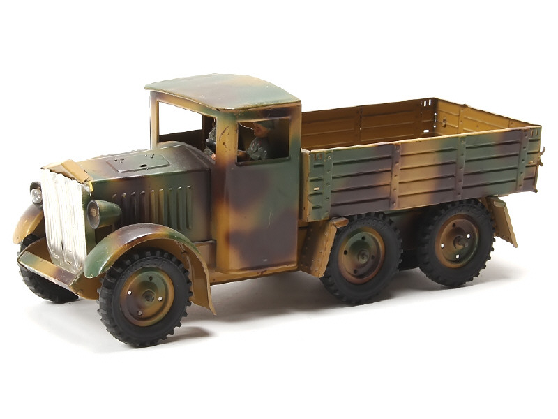 moteur à clef (fonctionne) - phares (manque une ampoule) électriques (à revoir) - avec 2 soldats (parties cassées) - quelques petits manques & parties non d'origine - toit repeint avec quelques petites retouches & traces d'oxydation par endroits - goupille arrière tordue