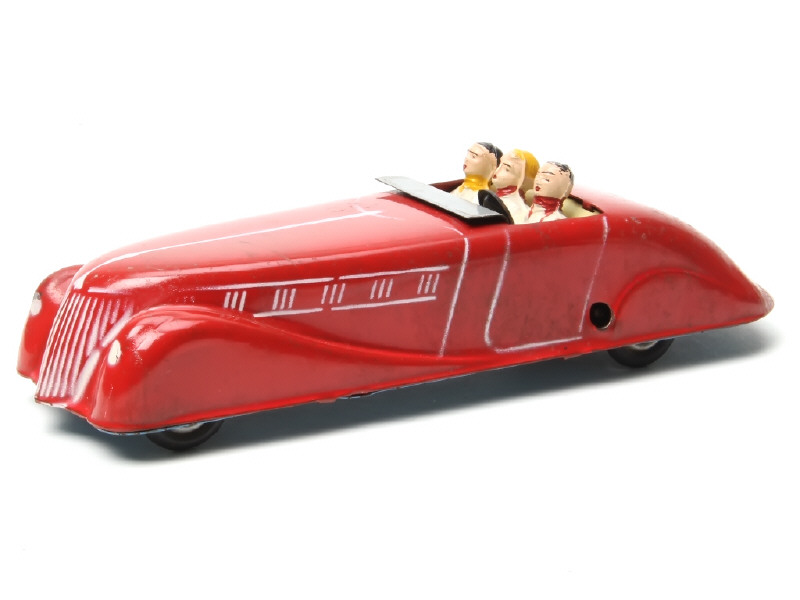 longueur 23 cm - moteur à clef (fonctionne) - version de 1937, avec 3 personnages & sans logo - quelques légères traces d'oxydation notamment sur le moteur