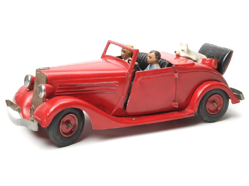 longueur 32 cm - moteur à clef (fonctionne) - avec direction par le volant - version de 1938 avec 4 aérateurs de capot horizontaux, pare-chocs rapportés & porte conducteur ouvrante - avec conducteur, passagère, chien & valise (d'origine) - traces d'oxydation sur l'axe de roues arrière & le moteur - quelques restaurations & petits manques