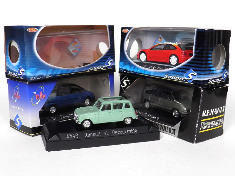 miniatures reproduisant les modèles : RENAULT 4L, RENAULT ESPACE, PEUGEOT 806 & CITROEN XSARA WRC