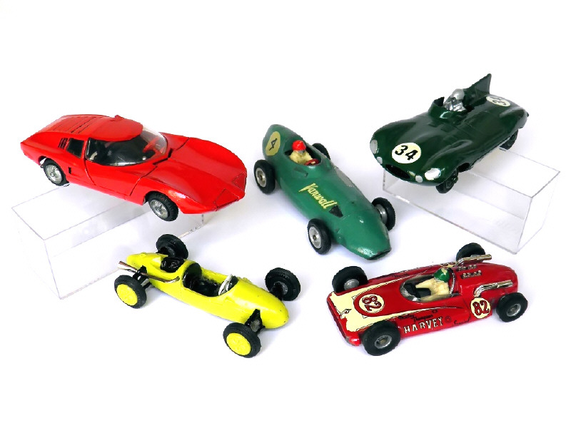 états de 'B' à 'R' - miniatures reproduisant les modèles : VANWALL, HARVEY, CHEVROLET MONZA, COOPER (manque pilote) & JAGUAR D - on y retrouve les marques : SOLIDO, TEKNO & CRESCENT TOYS
