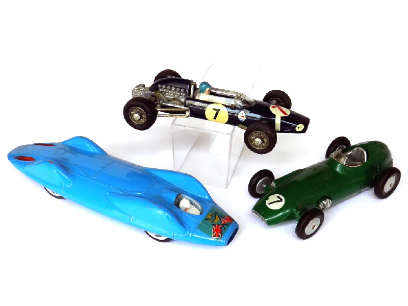 miniatures reproduisant les modèles : COOPER MASERATI (échappements & rétroviseurs cassés), BRM & BLUEBIRD (version avec jantes métal)
