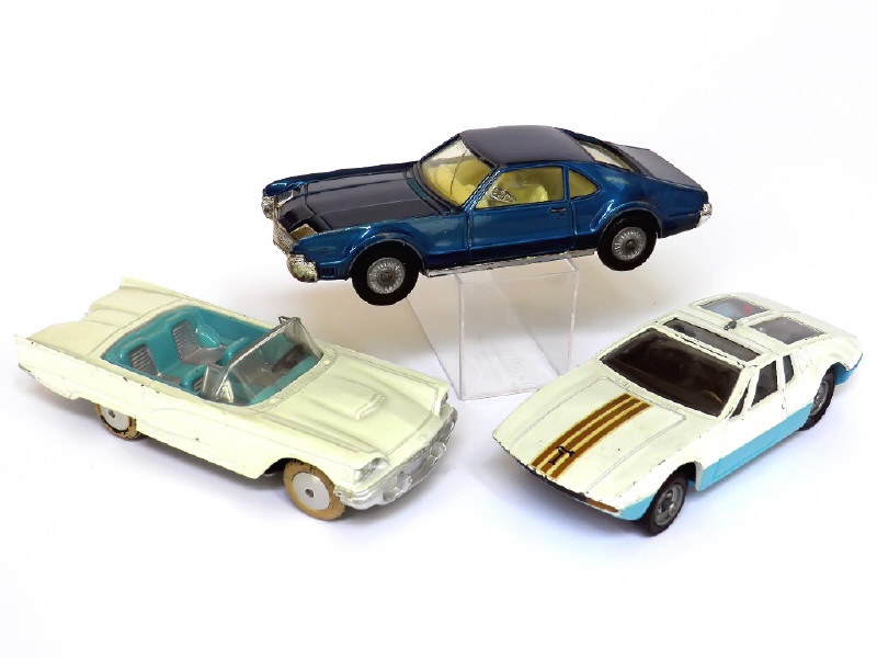miniatures reproduisant les modèles : DE TOMASO MANGOUSTA (antenne cassée), FORD THUNDERBIRD (pneus peints en blanc) & OLDSMOBILE TORONADO (état 'D' avec pare-brise fendu)
