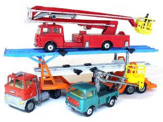 états de 'C' à 'D' - miniatures reproduisant les modèles : FORD avec semi porte-autos (manque rétroviseurs), BEDFORD SNORKEL pompiers (une marque sur le pare-brise & détails de peinture ajoutés) & JEEP FC150 avec nacelle élévatrice
