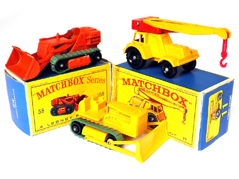 comprend : (MB11) TAYLOR JUMBO crane (boîte état 'd'), (MB11) CATERPILLAR D8 bulldozer (avec chenilles séchées) & (MB58) DROTT excavatrice (chenilles séchées, boîte état 'a') - série 1-75