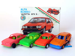 échelles 1/48ème - réalisations en plastique - un modèle en kit monté (manque une porte) avec planche d'autocollants & boîte état 'a' (légèrement tachée) - on y retrouve les modèles : ALFA SUD, ALFETTA berline, ALFETTA GTV6 coupé & JUNIOR GT coupé