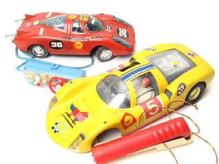 comprend une FERRARI de marque BANDAI, moteur à piles (phares fonctionnent le reste à revoir), état 'C' & une PORSCHE de marque SANCHIS pour pièces état 'F'
