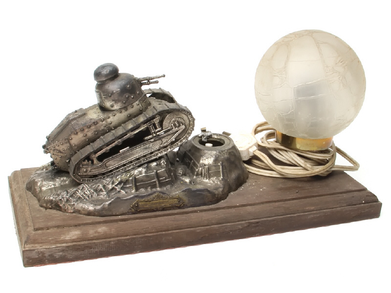 dimensions : 30 x 12,5 x 15,5 cm - réalisé par les anciens soldats français de la première guerre mondiale 'gueule cassée' - non testé - tourelle du char pivotante, interupteur dissimulé dans la sculpture - porte l'inscription gravée 'CAMP DE MOURMELON' - encrassé - possibilité de petits manques