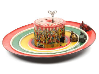 diamètre : 24 cm - avec moteur à clef (fonctionne) & 3 voitures de course - en action, le plateau oscille & fait bouger les automobiles - très légères rayures & déformations par endroits