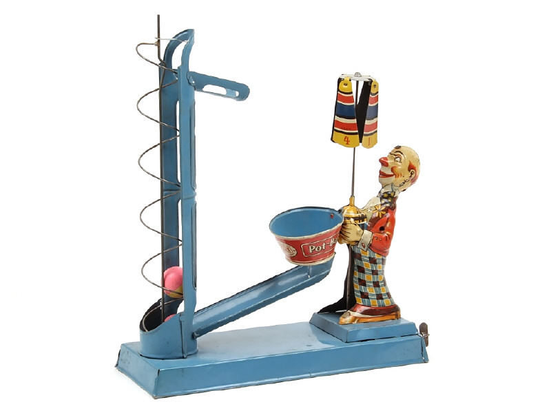 hauteur : 34 cm - moteur à ressort (fonctionne) - en action, le canard (manquant) & le parasol du clown tournent tandis que les 2 balles montent à l'aide de la vis sans fin puis tombent dans le panier percé du personnage avant de retourner à leur point de départ pour recommencer leur circuit - quelques petites traces d'oxydation