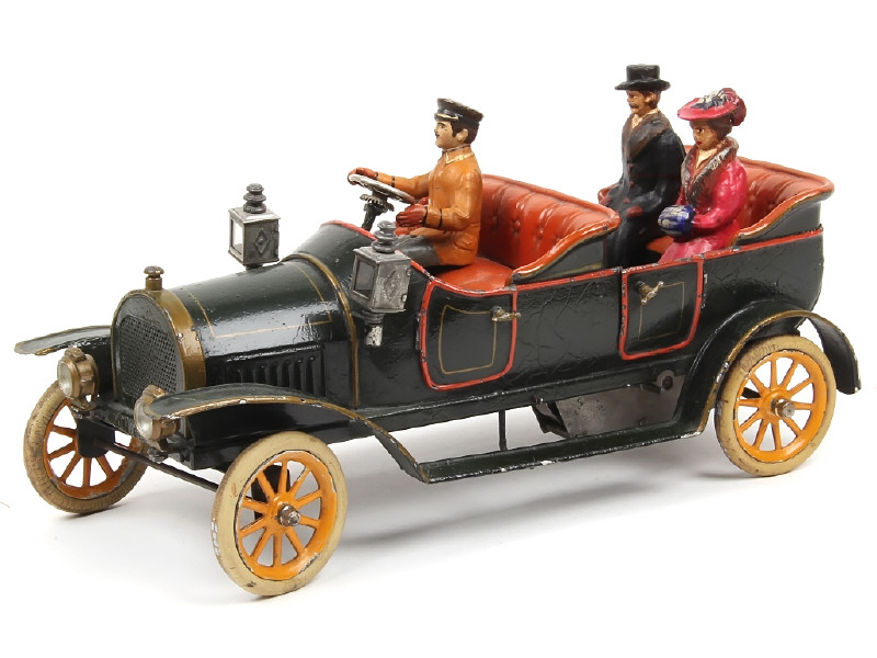 fabrication des années 1900 - longueur 33 cm - avec moteur à clef (fonctionne), direction par le volant, 4 portières ouvrantes & 3 personnages (repeints & non d'origine) - une lanterne déficiente - peinture craquelée - TRES BEL ETAT DE CONSERVATION POUR UN MODELE DE CETTE EPOQUE !