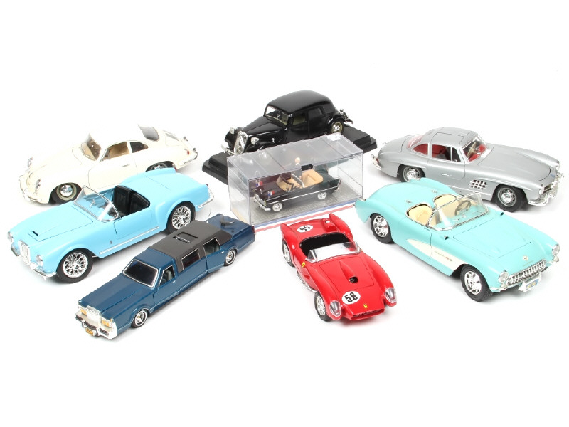 comprend notamment : SIMCA PRESIDENTIELLE DE GAULLE, FERRARI 250 TESTA ROSSA, CHEVROLET CORVETTE, LANCIA AURELIA & MERCEDES 300 SL & CITROEN 15 CV - on y joint une limousine (détails de peinture ajoutés & antenne tordue) en état 'B'