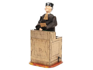 hauteur 23 cm - moteur à ressort (fonctionne) - quelques petits manques de peinture par endroits (principalement sur une main) - papier plié