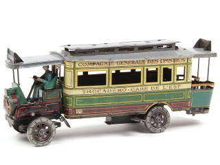 version sans panonceau de toit latéral - il s'agit du premier autobus créé par la marque en 1911 - longueur 29 cm - avec moteur à ressort (fonctionne) & direction - légers frottements avec micro-taches (parties ternies) sur l'ensemble du modèle - importants manques de peinture sur les bandages de roues - BEL ETAT DE CONSERVATION !