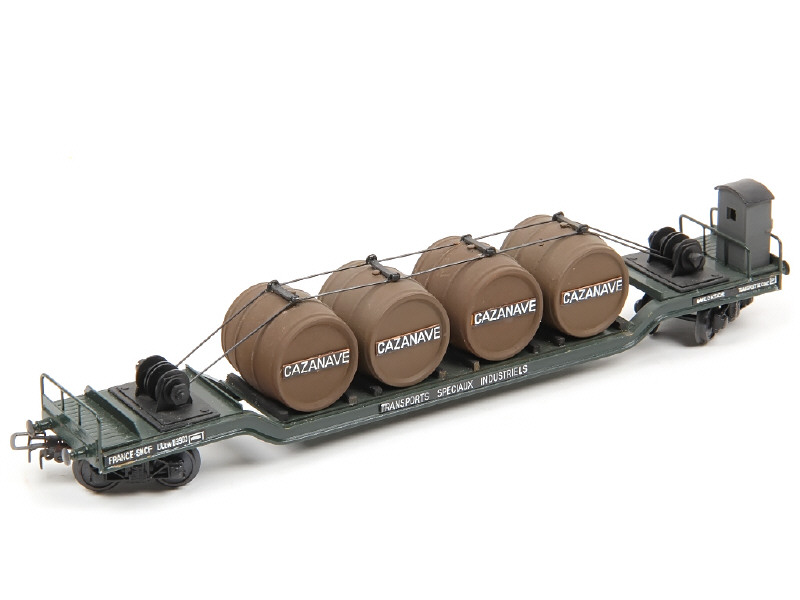 V.B. 'HO' (FRANCE) Wagon-plateau surbaissé porte-tonneaux 'CAZANAVE' vert & marron