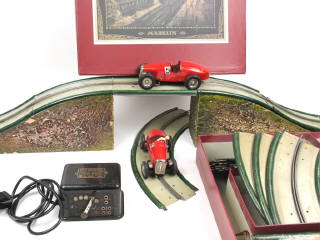présenté dans 2 coffrets (état 'c' & 'e') - comprend : 2 voitures de course avec moteur & éclairage électrique (non testés), 49 rails différents, 2 éléments de pont, un transformateur avec variateur & notices - parties ternies sur les rails - avec éclats plus ou moins importants par endroits - manque un conducteur - possibilité de petits accessoires manquants