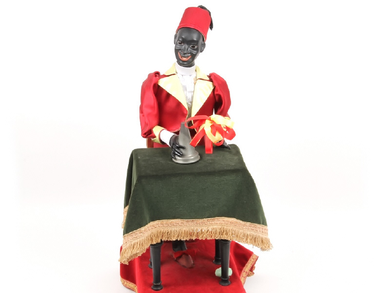 hauteur : 64 cm - fonctionne parfaitement - début XXe siècle - beau personnage, tête caractérisée en biscuit, bouche ouverte souriante, yeux en sulfure marron, mains en biscuit - corps en composition (quelques craquelures sur les jambes) - vêtements anciens - 5 mouvements (2 hochements de tête, bras avec baguette (2) & main sur godet) - il soulève & baisse successivement le cône en métal laissant apparaitre à chaque fois un objet différent (4 en tout dont un dé, une montre fissurée, un bijou & des grelots) - mécanisme dans une table en bois avec nappe en velour - monté sur une boite à musique dans un coffret en bois également recouvert de velour (fonctionne) - clé d’origine LB - ETAT EXEPTIONNEL POUR UN OBJET DE CET EPOQUE !