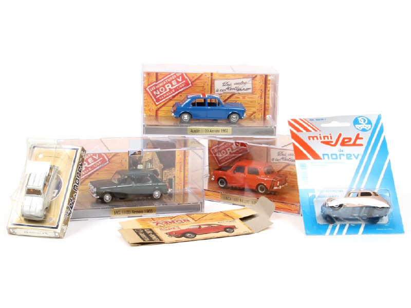 comprend : MG 1100, SIMCA 1000 RALLYE, AUSTIN 1100, RENAULT 4L & DYANE - on y joint une boîte de l'ALFA-ROMEO GIULIETTA en état 'a' (avec petite tache sur une face) & une étiquette RHODIALITE