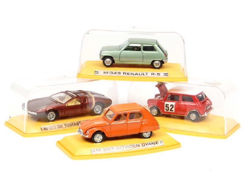 comprend : CITOREN DYANE, DE TOMASO MANGOUSTA, RENAULT 5 & rallye - quelques parties de socle légèrement fondues