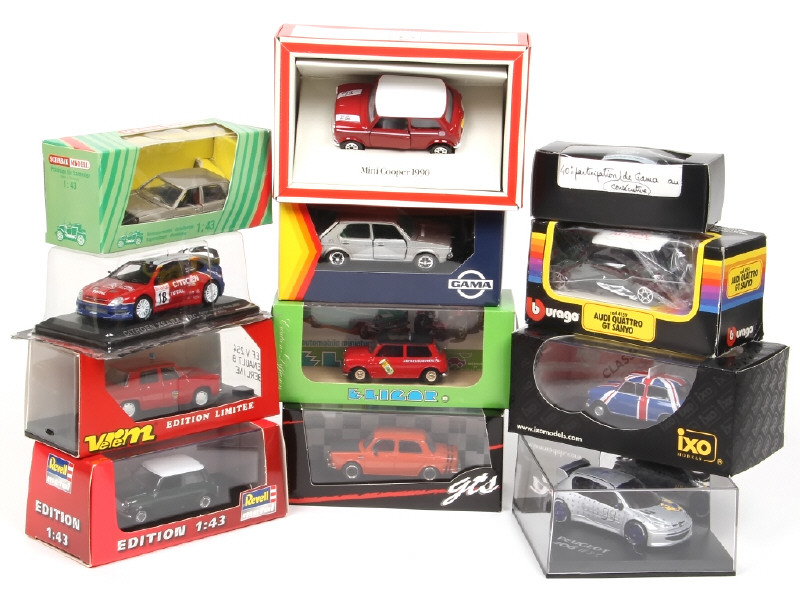 miniatures reproduisant notamment les modèles : MINI, RENAULT, SIMCA, VOLKSWAGEN & PEUGEOT - on y retrouve notamment les marques : GAMA, IXO, ELIGOR & REVELL