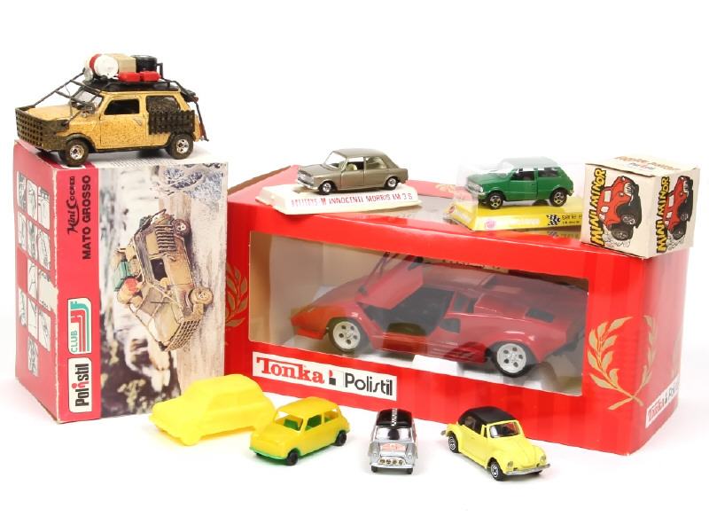 différentes échelles - comprend notamment : MINI COOPER, VOLKSWAGEN & LAMBORGHINI - on y retrouve notamment les marques : POLISTIL, MEBETOYS & POLITOYS - on y joint une voiture (réalisation en plastique) de marque anglaise