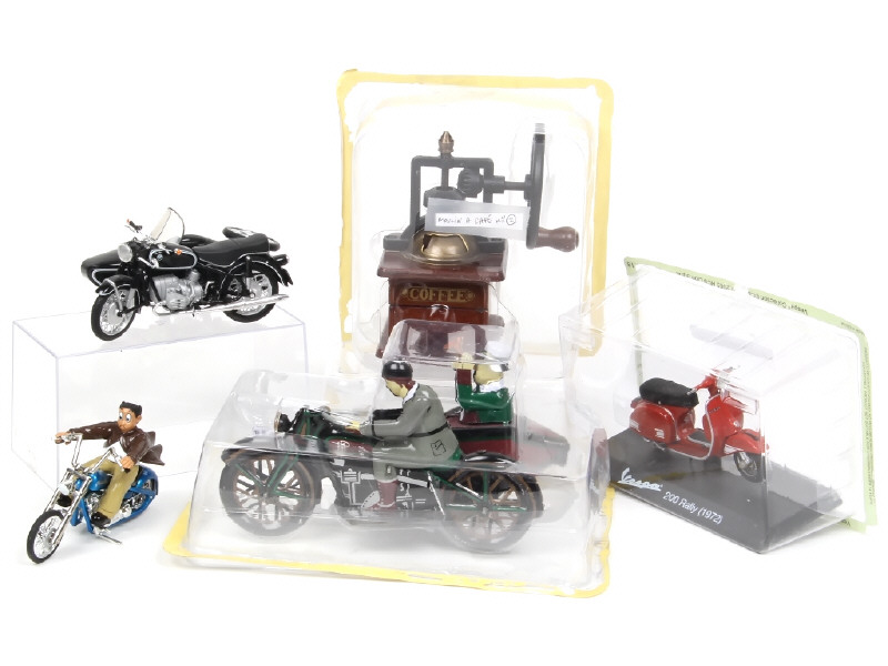 comprend : SIDE-CAR (moteur mécanique, fonctionne), BMW, VESPA & MOTOCYCLISTE - on y joint une miniature de moulin à café - on y retrouve notamment la marque DEL PRADO - 3 modèles en boite (états 'd')