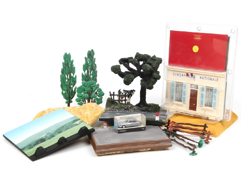 comprend notamment : CITROEN DS, bâtiment 'GENDARMERIE NATIONALE, 4 arbres, 4 barrières & une vache - on y retrouve notamment la marque : NOREV