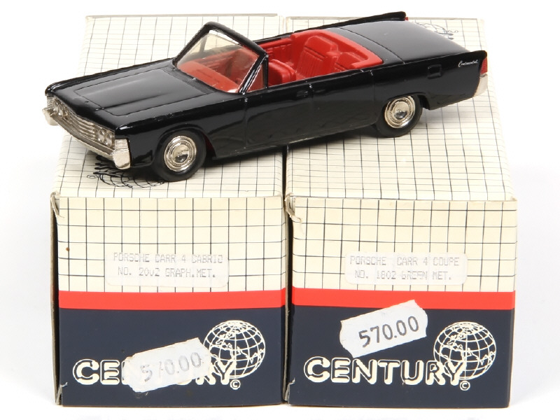 comprend : PORSCHE CARRERA 4 (2 exemplaires - un essuie-glaces à refixer) & LINCOLN CONTINENTAL 1965 (en état 'B' - plancher & bas caisse avec rayures - manque sigle de calandre & rétroviseurs - sans boîte)