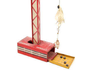 hauteur 113,5 cm - réalisation de 1937 en bois & tôle lithographiée - avec système de poulies, de billes (4 exemplaires) & un parachutiste en bois peint - quelques manques de peinture avec traces d'oxydation plus ou moins importantes par endroits - une fêlure sur le socle & la plateforme avec quelques petits éclats sur les parties en bois - parachute endommagé