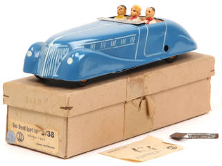 longueur 23 cm - moteur à clef (fonctionne) - version de 1937, avec 3 personnages & sans logo - avec bon de contrôle & clef - boîte tachée - SUPERBE !