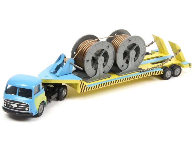 C.I.J. (FRANCE) 4/75 SAVIEM LRS Semi-remorque surbaissée porte-bobines de câble bleu & jaune vert