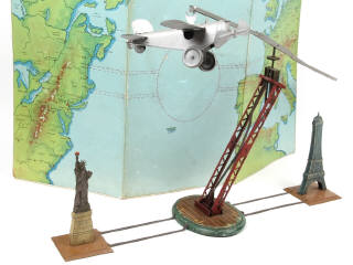 dimensions : 57 X 8 X 32 cm - avec système mobile représentant la statue de la liberté & la Tour Eiffel, balancier amovible, avion en tôle & carte d'itinéraire de la traversée de l'atlantique pliable - moteur à ressort (fonctionne) - en action, l'hélice de l'avion 'SPIRIT OF ST LOUIS' tourne & le fait avancé autour du mât mobile - manque convercle de boîte (avec cale) - quelques petits frottements & traces d'oxydation par endroits