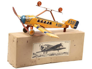 envergure : 51 cm - avec système à élastique entraînant l'hélice & poulies supérieures - boîte légèrement déformée & tachée - sans élastique ni petit élément d'extrémité de carlingue