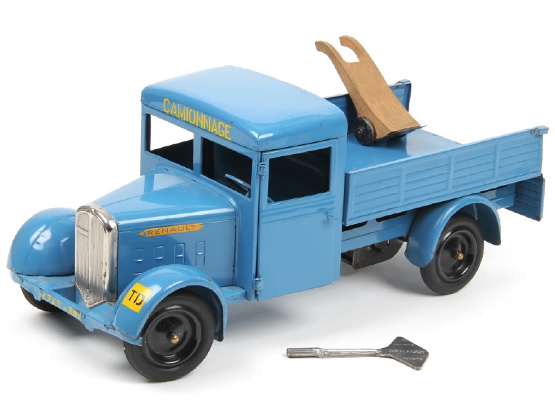 longueur : 43 cm - avec moteur à clef (fonctionne), direction, clef & diable - version économique sans phare avec inscriptions au pochoir 'CAMIONNAGE' sur le fronton de cabine, 'TD' sur l'aile avant gauche & '4748 - RN6' à l'arrière & sur le pare-chocs avant - très légères traces d'oxydation & petites déformations par endroits - un petit manque sur un décalque