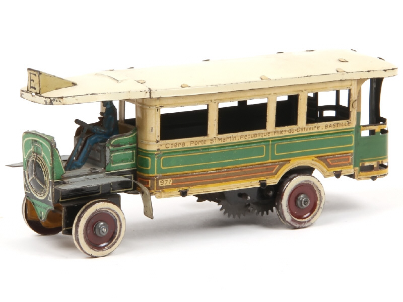 longueur : 20,5 cm - avec moteur à ressort (fonctionne) & direction - peinture du toit légèrement altérée (frottée avec une légère fêlure) - petites traces d'oxydation avec manques de peinture par endroits (principalement sur les bandages de roues) - un détail de peinture ajouté sur le cartouche de toit