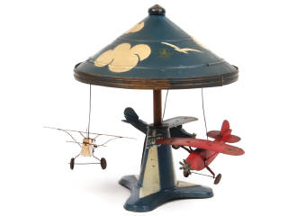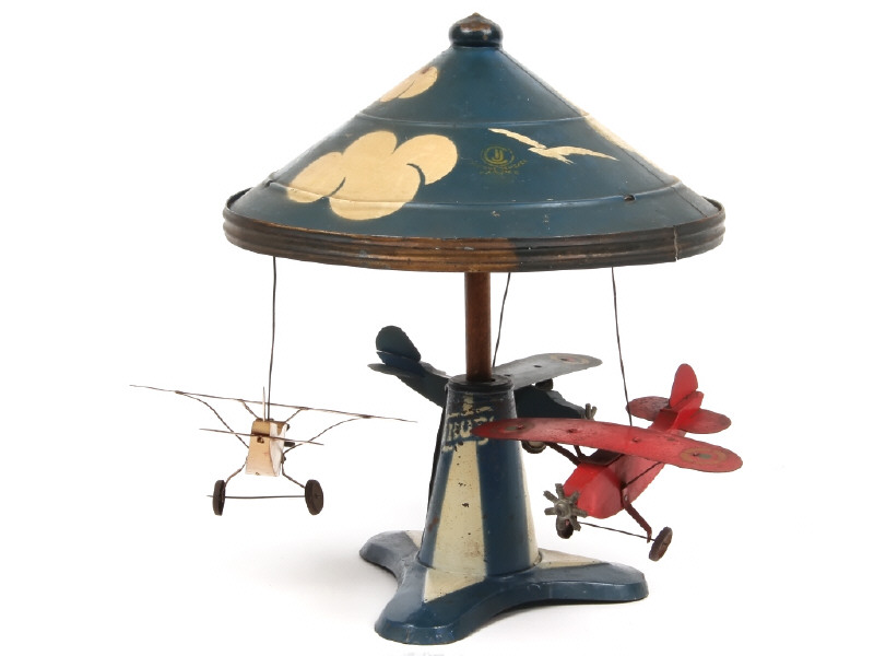 C.I.J. (FRANCE) Manège de 3 avions en tôle peinte & bois bleu, rouge & jaune