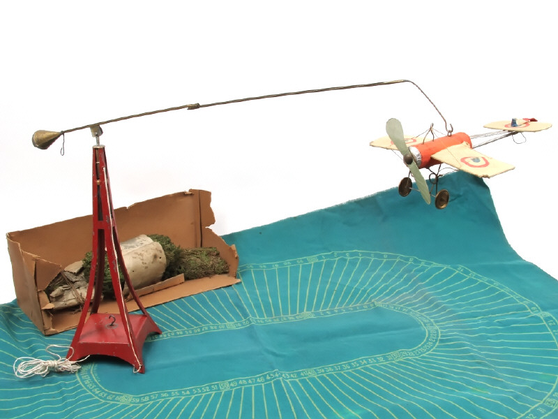 représente un Morane Saulnier & la Tour Eiffel : hauteur : 80 cm - avec système à cordelette & tapis de jeu - petites restaurations par endroits - possibilité de petits accessoires manquants