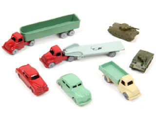 petite échelle - états de 'A' à 'C' - comprend : 3 camions (3 exemplaires différents dont un avec traces de métal fatigue & manques de matière), 2 voitures & 2 chars
