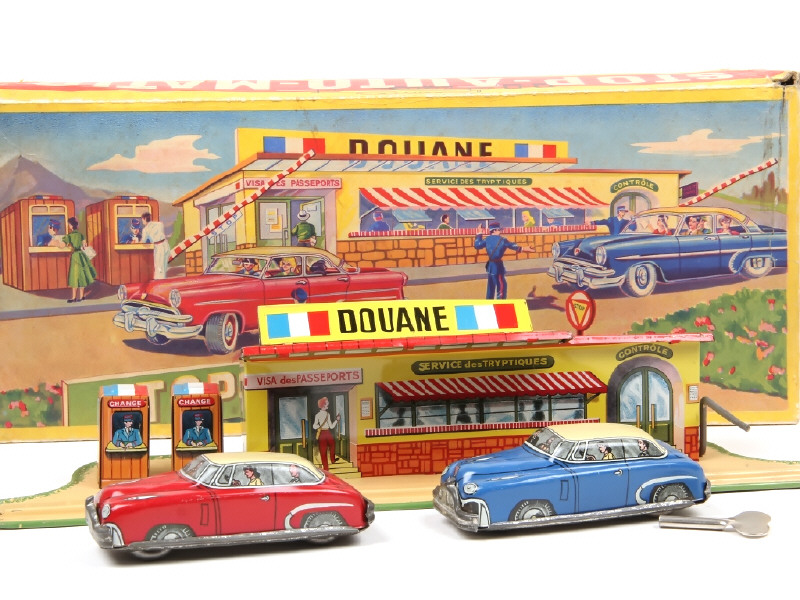 dimensions 38 x 38 cm - contient : un poste de douanes, 3 rails courbes, un rail droit & 2 voitures mécaniques (moteurs à clef fonctionnent) - avec clef & cale - quelques éléments manquants - parties ternies